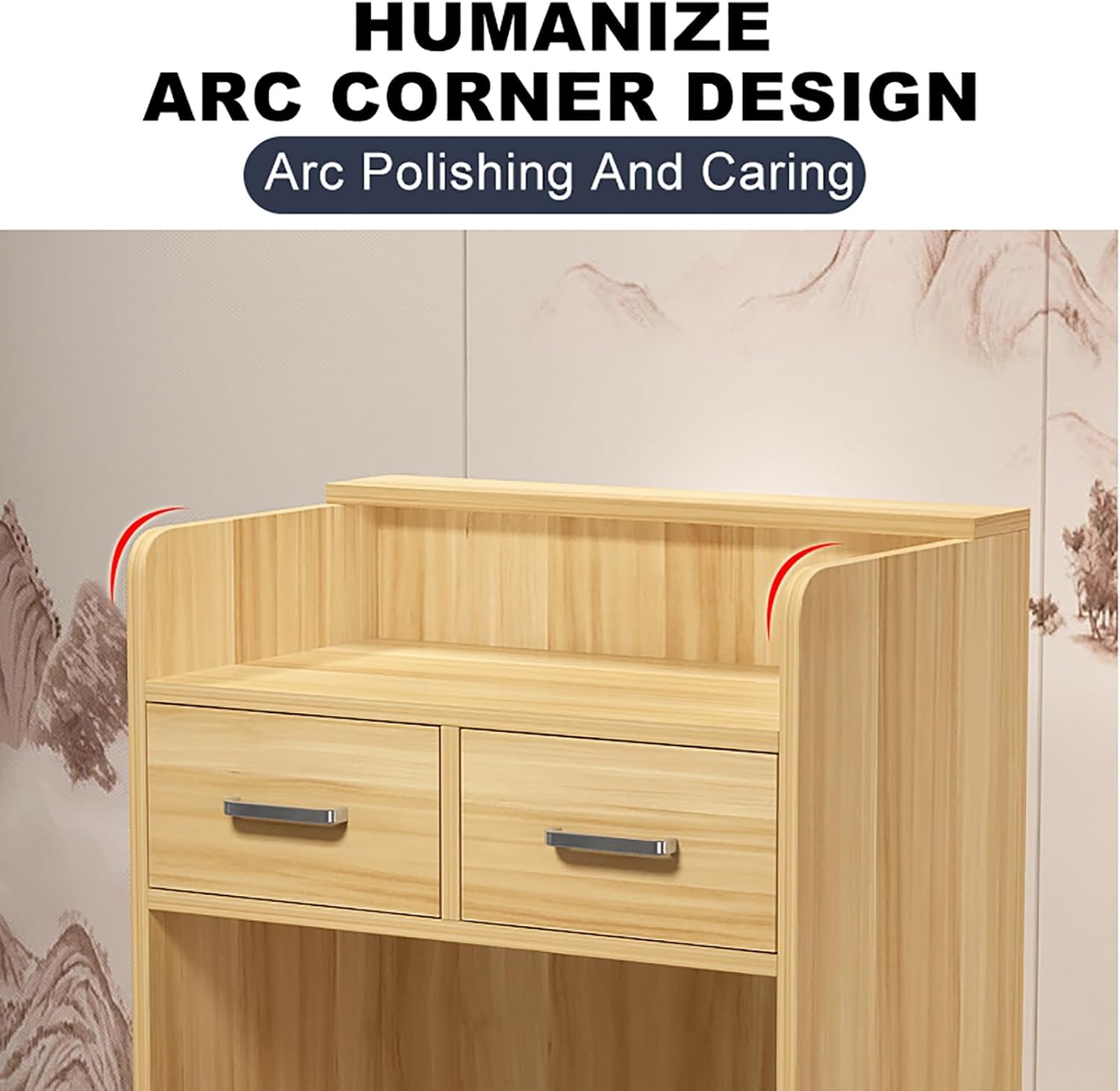 Retail Counter for Checkout,Reception Desk with LED Lights,with Lights & Lockable Drawers,Modern Welcome Desk,Company Counter Front DeskReception Desk is not only a functional working space - it is a stellar centerpiece crafted to transform your lobby, beauty salon, clinic, restaurant, or office space.Reception Desk with LED Lights for Lobby Beauty SalonThe Front Counter Desk is equipped with an LED light bar.Different lighting colors can be easily matched to different venues, matching different lighting colors to different décor styles. High-Quality of HardwareWe take your privacy and property security very seriously. Now you can enjoy a more private work area, provides an added level of security while creating a dignified look.Stream-line design with smooth veneer surface, this reception desk highly shows modernization and elegance for welcoming customers and clients.Simple and clean design concept effectively organize your work space, gives an aesthetic look.including drawer slides, cabinet door aisle chains, and keyboard slides. Opening and closing the tray smoothly !Sufficient Storage SpaceThe spacious desktop with keyboard tray has enough room for a computer, cash register and even promotional materials. Whether it's a lobby, salon, clinic, restaurant or office space, it creates a stunning atmosphere!Material: Engineered Wood, MDFFocus on Details for Good ProductsReception DeskHigh-quality Metal RailThe Reception Counter Table has 1 drawers, which are equiped with metal slides. Open and close drawers smoothly.Reception DeskSoft Open & Close HingesHigh-quality hardware is used for the Front Counter Desk to make opening and closing doors quieter and easier.Notice:1. Note: Due to the particularity of the furniture, there will be slight errors in the finished product, which is normal. The data is for reference only and must be based on th
