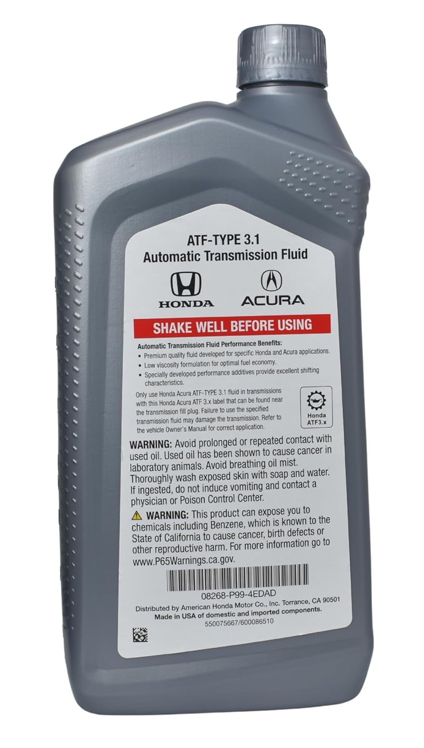 Specifically formulated for Honda vehicles and must meet Honda’s stringent engineering standards. These standards meet or exceed the typical industry performance specifications found in many off-the-shelf fluid brands that deceptively flaunt tag lines like: “recommended for...”, “compatible for use in...” or “formulated for use in...”. However, Honda Genuine fluids are specifically engineered for Honda vehicles and are made to “meet the specs” for your Honda vehicle. Only use in transmissions with the Honda ATF 3.x label found near the transmission fill plug