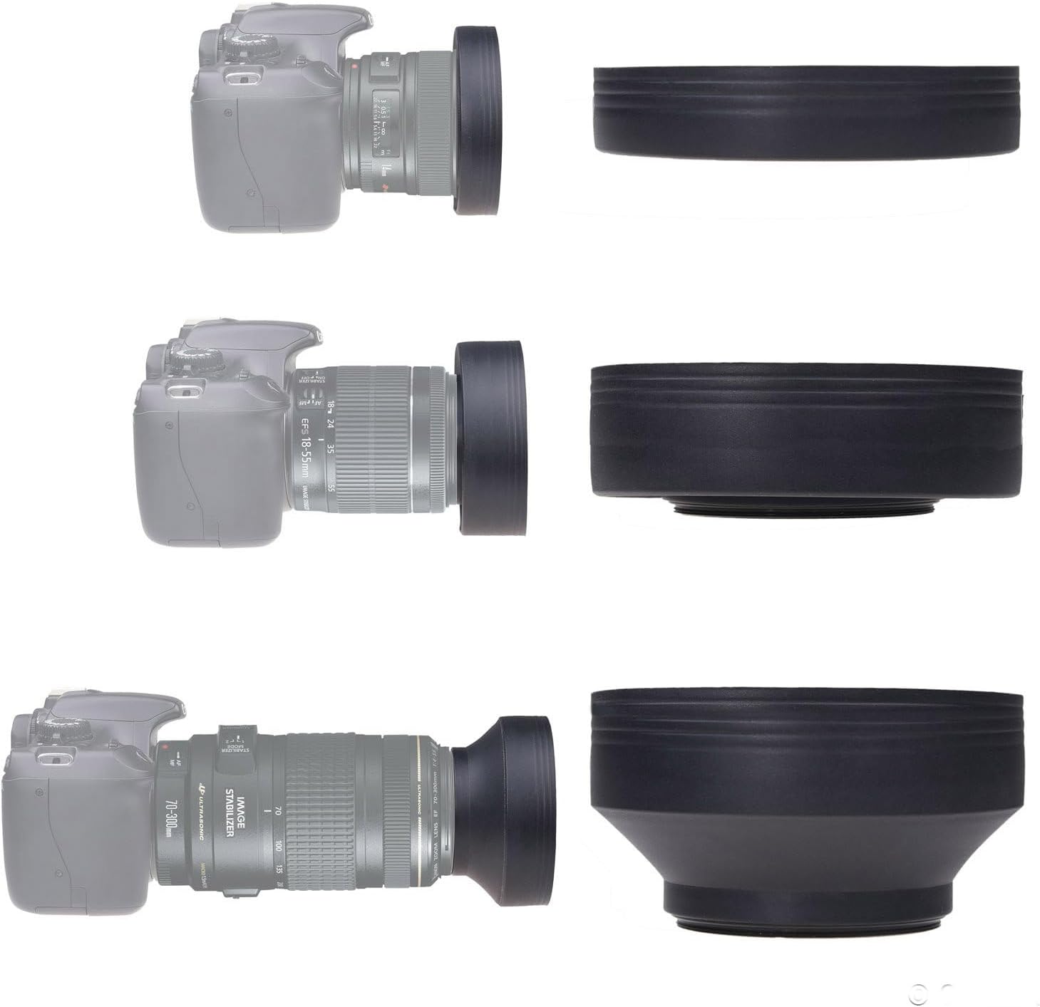 • ✅ COLLAPSIBLE IN 3 STEPS ►The rubber lens hood can be folded out in 3 steps to offer different levels of sun shading. Because the rubber lens hood can be fully collapsed, you can leave it on your lens so you can always use it when you need it.