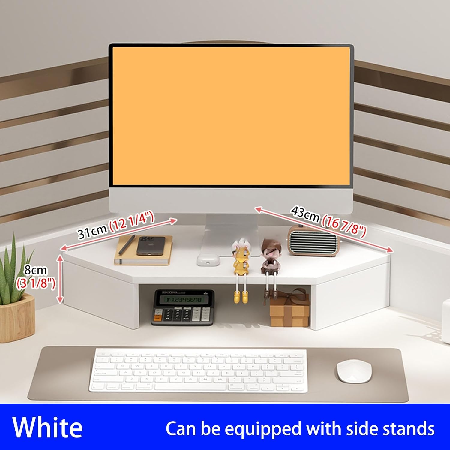 Computer Screens Organizer Storage Rack:Transform your workspace into an organized and efficient environment with our Corner Monitor Stand. Designed to fit seamlessly on L-shaped or corner desks, this modern shelf is the perfect solution for anyone looking to maximize desk space while enhancing productivity. Crafted from high-quality density board, our stand is available in classic colors: brown, black, and white. Its sturdy construction ensures durability, making it a reliable addition to your workspace. With a height of 8cm (3 1/8"), it elevates your monitor to a comfortable viewing level, helping to reduce eye strain during long hours of work or gaming. This versatile stand is not just for monitors; it can accommodate laptops, tablets, and even serve as a display for your TV or makeup essentials. The spacious bottom shelf provides additional storage for your mouse, stationery, or other small items, keeping your desk clutter-free and organized. Whether you’re working from home, studying, or simply enjoying your favorite shows, our Corner Monitor Stand is designed to enhance your experience. Remember, a well-organized desk contributes to better focus and increased productivity. Please note that due to variations in display settings and lighting, the actual product color may differ slightly from what you see on your screen. Additionally, manual measurements may result in a slight deviation of 1-2 cm. We are committed to your satisfaction. If you have any questions or concerns during your purchase, please don’t hesitate to reach out to us. Elevate your workspace today with our Corner Monitor Stand!