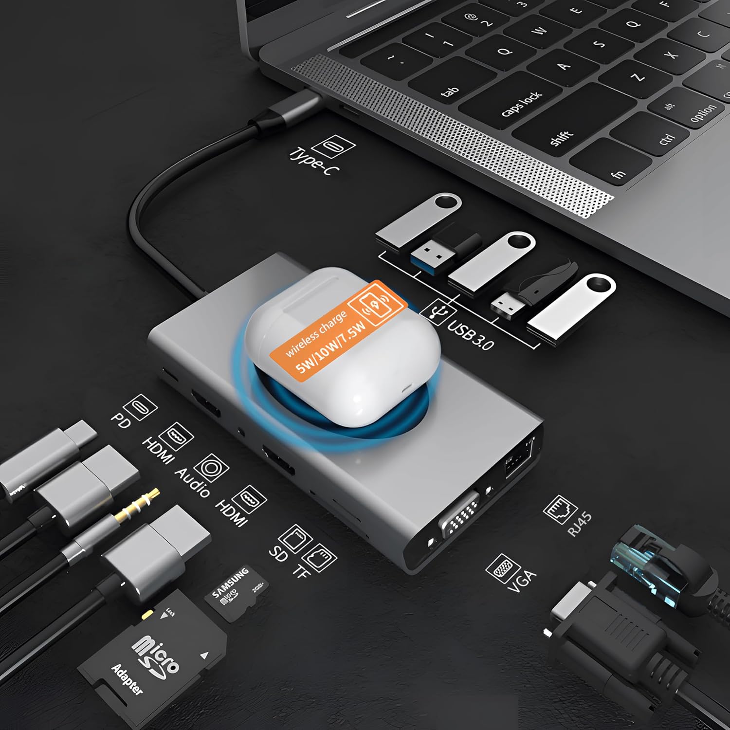 The 14-in-1 USB-C Docking Station measures 4.25 inches in length, 2.48 inches in width, and 0.248 inches in height, and comes with a 6.3-inch interface cable. Housed in a sleek aluminum alloy casing, it weighs just 0.4 pounds—providing excellent heat dissipation, stability, and a premium tactile experience. This docking station supports versatile connectivity expansion and features intelligent wireless charging with a built-in fast-charging chip compatible with multiple power outputs. It supports a wide range of smartphones, including models from Apple, Huawei, and Samsung.