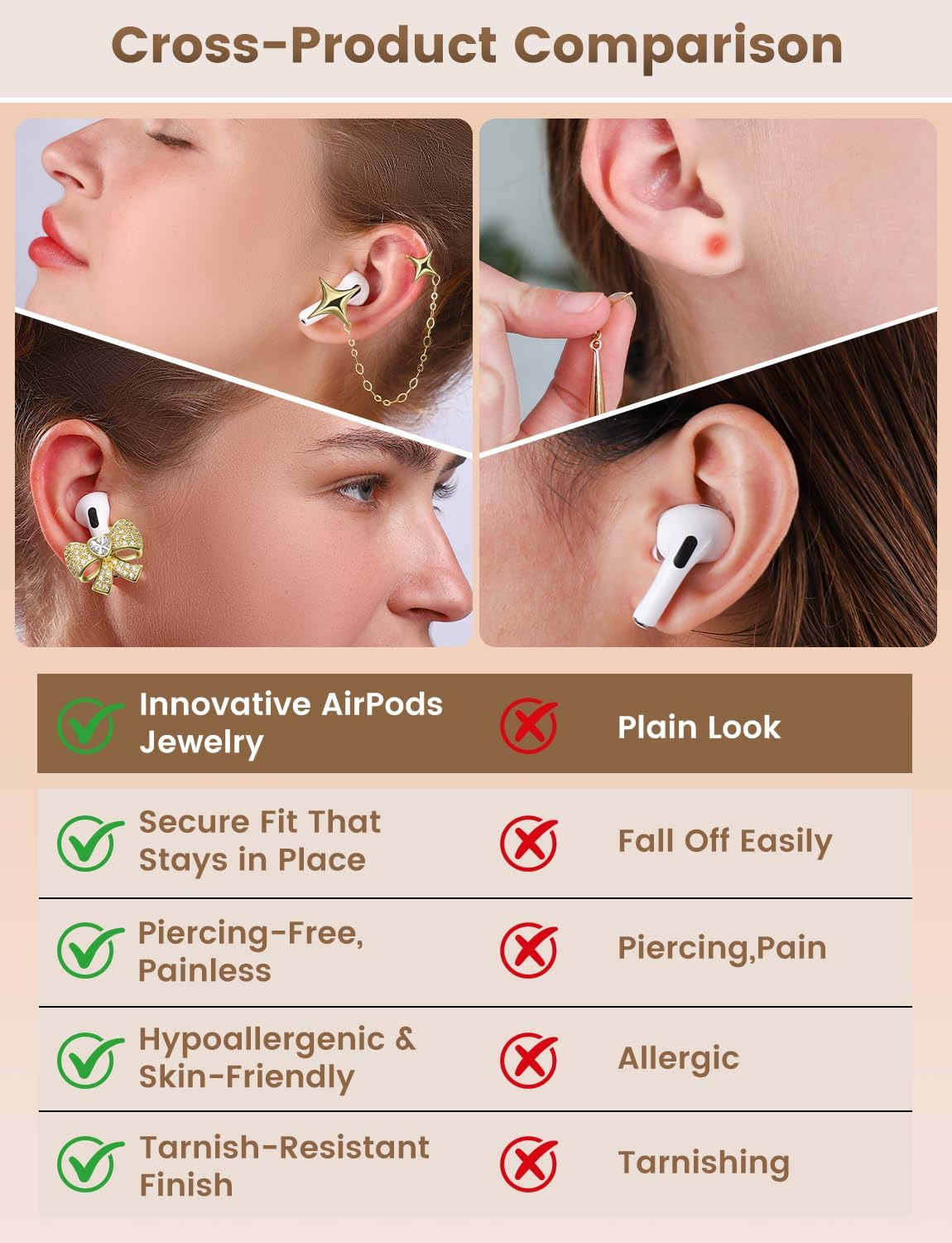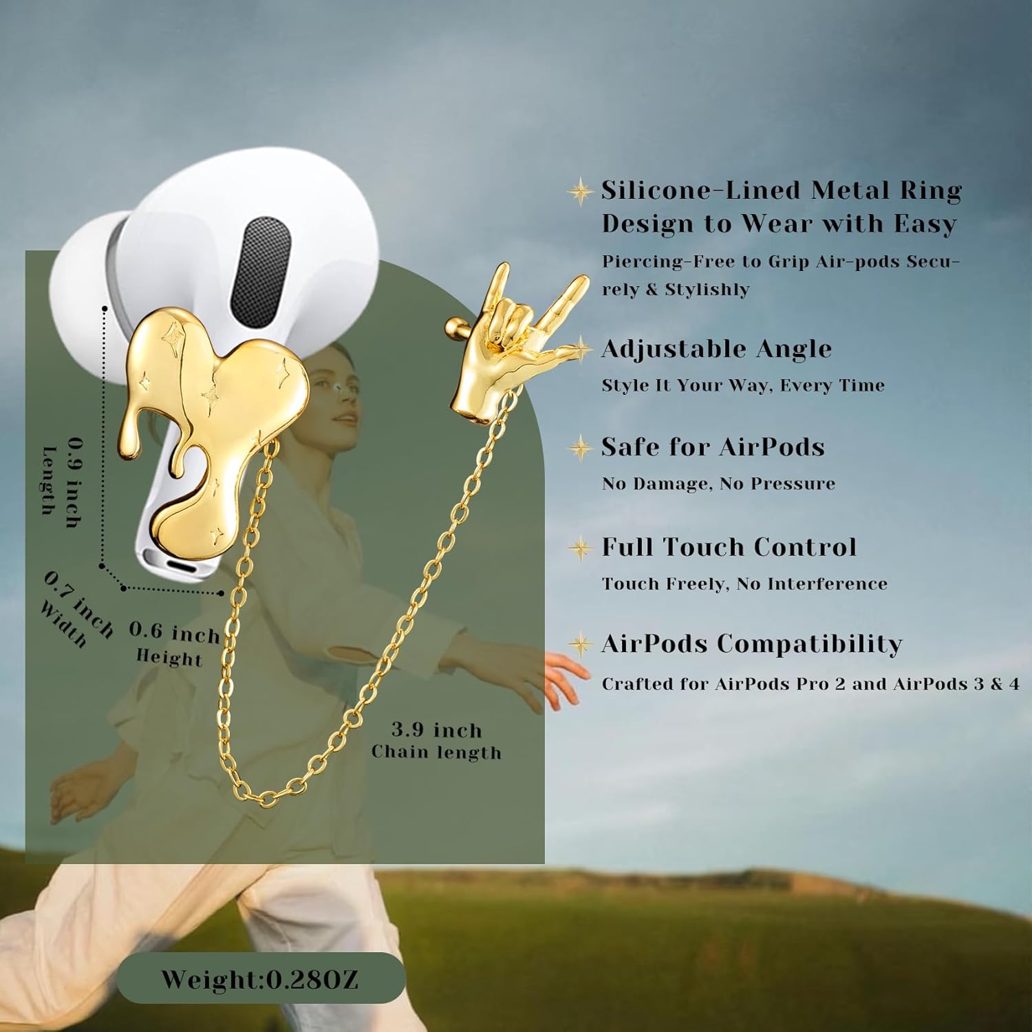 • First airpods jewelry engineering for airpods: Clever design with a discreet, silicone-lined metal ring and solid ear chain that keeps your airpods securely without worry of falling it out