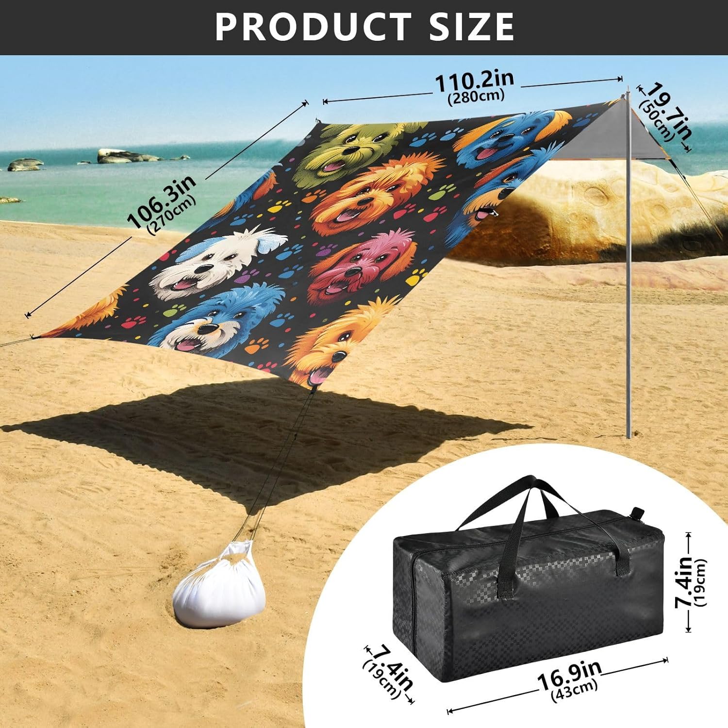 Unpack Cooling trip in 10 minutes! Our 280x320cm beach tent features silver-coated polyester oxford fabric that actively deflects heat while providing UPF 50+ protection-say goodbye to sunburns and squinting! Express your style with eye-catching, tropical-inspired prints that transform ordinary shade into a vibrant oasis. Engineered for stubborn coastal winds, the reinforced frame supports extra guy ropes alongside the included 4 refillable sandbags (use the free shovel!), 4 heavy-duty steel stakes, and 4 reinforced ropes. This high-grade anchoring system laughs at 25mph gusts while you relax. Adventure Beyond Sand: Beach lounging Lakeside camping Park picnics Fishing trips Festival hangouts Backyard "staycations