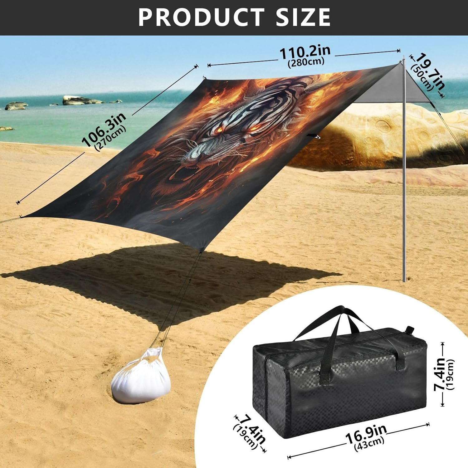 Unpack Cooling trip in 10 minutes! Our 280x320cm beach tent features silver-coated polyester oxford fabric that actively deflects heat while providing UPF 50+ protection-say goodbye to sunburns and squinting! Express your style with eye-catching, tropical-inspired prints that transform ordinary shade into a vibrant oasis. Engineered for stubborn coastal winds, the reinforced frame supports extra guy ropes alongside the included 4 refillable sandbags (use the free shovel!), 4 heavy-duty steel stakes, and 4 reinforced ropes. This high-grade anchoring system laughs at 25mph gusts while you relax. Adventure Beyond Sand: Beach lounging Lakeside camping Park picnics Fishing trips Festival hangouts Backyard "staycations