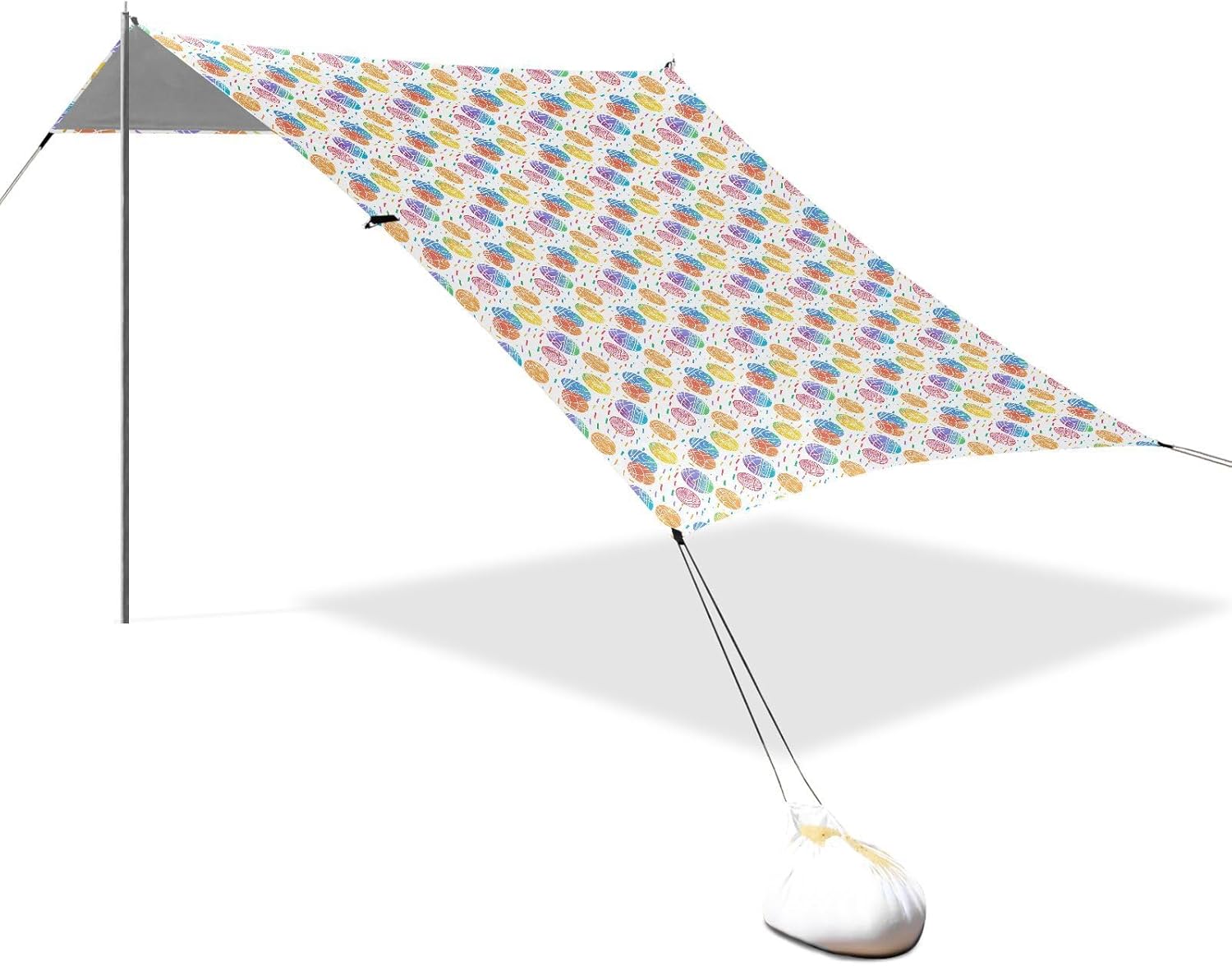 Unpack Cooling trip in 10 minutes! Our 280x320cm beach tent features silver-coated polyester oxford fabric that actively deflects heat while providing UPF 50+ protection-say goodbye to sunburns and squinting! Express your style with eye-catching, tropical-inspired prints that transform ordinary shade into a vibrant oasis. Engineered for stubborn coastal winds, the reinforced frame supports extra guy ropes alongside the included 4 refillable sandbags (use the free shovel!), 4 heavy-duty steel stakes, and 4 reinforced ropes. This high-grade anchoring system laughs at 25mph gusts while you relax. Adventure Beyond Sand: Beach lounging Lakeside camping Park picnics Fishing trips Festival hangouts Backyard "staycations