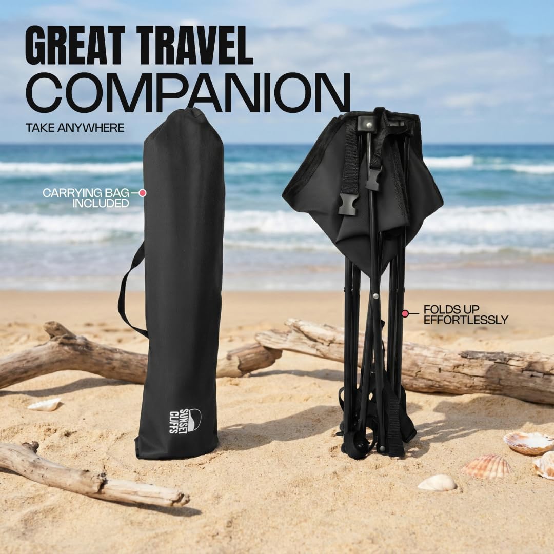 Elevate Your Outdoor Experience with the Sunset Cliffs Portable Beach Table.Keeping your food and drinks away from the sand is essential for a stress-free day at the shore. The Sunset Cliffs Portable Beach Table is engineered to provide a clean, stable surface wherever your adventures take you. Measuring 19” x 19”, this compact table offers the perfect balance between a spacious surface area and a lightweight, portable footprint.Stable and Reliable in Any Environment Built with a reinforced metal frame and high-density nylon, this table is designed for durability. The unique tension-strap system at each corner allows you to tighten the tabletop, ensuring a flat, level surface for your electronics, books, or meals. Dual mesh cup holders provide a secure spot for your drinks, preventing spills on uneven terrain or soft sand.Ready for Every Journey Forget bulky, heavy furniture. This side table collapses down into a sleek carrying bag, making it the ideal companion for beach trips, camping, tailgating, or backyard BBQs. Whether you are lounging by the ocean or relaxing in the mountains, enjoy the convenience and stability of Sunset Cliffs.