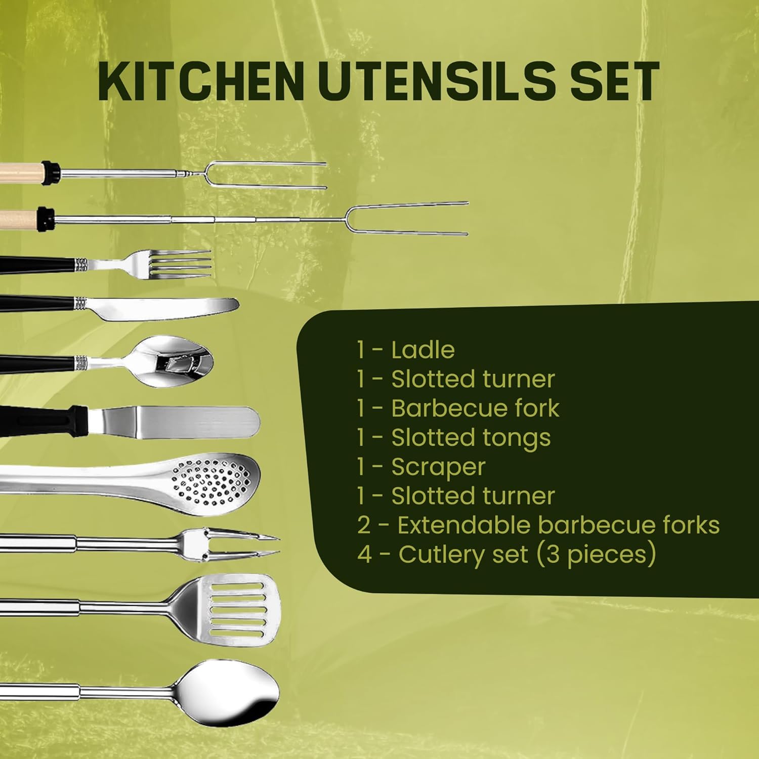 • COMPLETE SET: This incredible 27-piece camping and BBQ utensil set is everything you could possibly need! It includes knives, forks, spoons, serving tools, and all the essential kitchen accessories you could want. And it all comes in a convenient, portable carrying case!