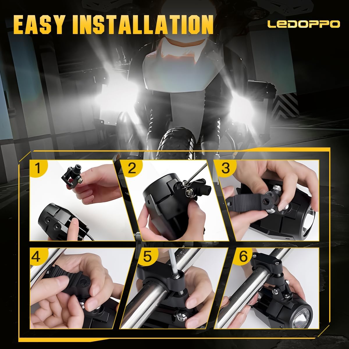 | Included Components | 1 x Approx 10ft Plug & Play Wiring Harnss(Include Inline Switch,Relay,Fuse), 2 X Clamp Mount Brackets, 2 X LED Motorcycle Driving Lights, 4 x 40mm Bolts(for 1in/25.4mm~1.25in/31.75mm O.D. Tube), 4 x 50mm Bolts(for 1.25in/31.75mm~1.4in/35.56mm O.D Tube) |