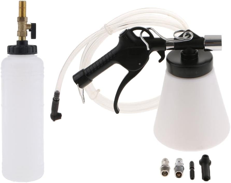 Description: - Brake fluid bleeder works with your air compressor to quickly assist in your brake bleeding! - Flush and refill the entire brake system by yourself with this brake fluid bleeder. - 34 oz Waster Brake Fluid Tank - 24 oz New Fluid tank that inserts into your master cylinder with provided adapters - Air requirement: 90 to 120 PSI, Air inlet: 1/4''- 18 NPTSpecification: - Material: Plastic+Metal - Color: As picture shown - Capacity: 1000ml, 750ml - Tube length: Approx 2m - Refill Container Length: 29 cm / 11.42 inch - Hole Diameter: 5 cm / 1.97 inchPackage Includes:1 Piece Refill Container1 Piece Hose3 Pieces Plastic Adapters1 Piece Air Pneumatic Tool1 Piece Tube4 Pieces HardwareNote:Please allow 0.5-1 inch difference due to manual measurement.(1 inch=2.54cm)Please check the size measurement and the picture carefully before making payment.Due to the difference between different monitors, the picture may not reflect the actual color of the item. Please understand,Thank you.