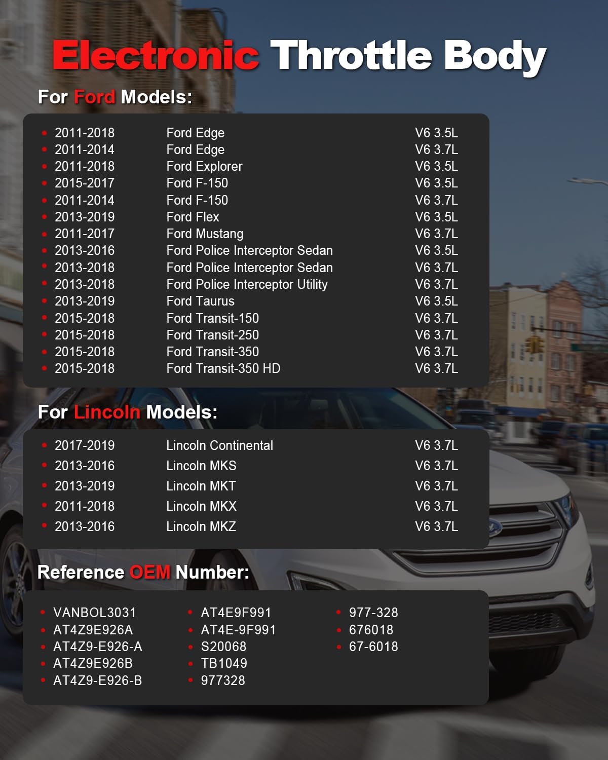 | Model | 2011-2019 Ford F150 Edge Explorer Transit-150 250 350 HD Mustang Taurus Flex Lincoln Continential MKS MKT MKX MKZ V6 |