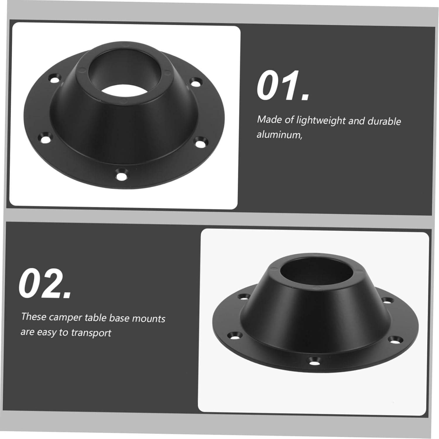 Package List 6 x bases x screws Characteristics -Material:Aluminum rv table base flush -Size:17.00X17.00X4.50cm/6.68X6.68X1.77in pedestal table base -Color:Black camper table base -Crafted from sturdy aluminum, this rv table base mount offers a lightweight and durable for securing your table in various settings, such as RVs and yachts rv accessories. -Enhance your dining experience with the RV table base aluminum base yacht table fixing accessories table base for rv. -Its reliable stability prevents table wobbling, a safe and enjoyable mealtime rv table base mount. -Installation is a breeze, requiring no tools. Additionally, its versatility extends beyond table fixation, making it a valuable accessory for securing other items camper table base mount. -Allows for easy portability, ensuring you can enjoy comfortable dining wherever you go rv table base mount silver.Goods Informationrv table base mount Features the aluminum material, which has high durability, not easy to deform.rv table mount base This rv table base mount is made of solid material, which can withstand long-lasting use.rv table base flush Fine workmanship, ensures practicality