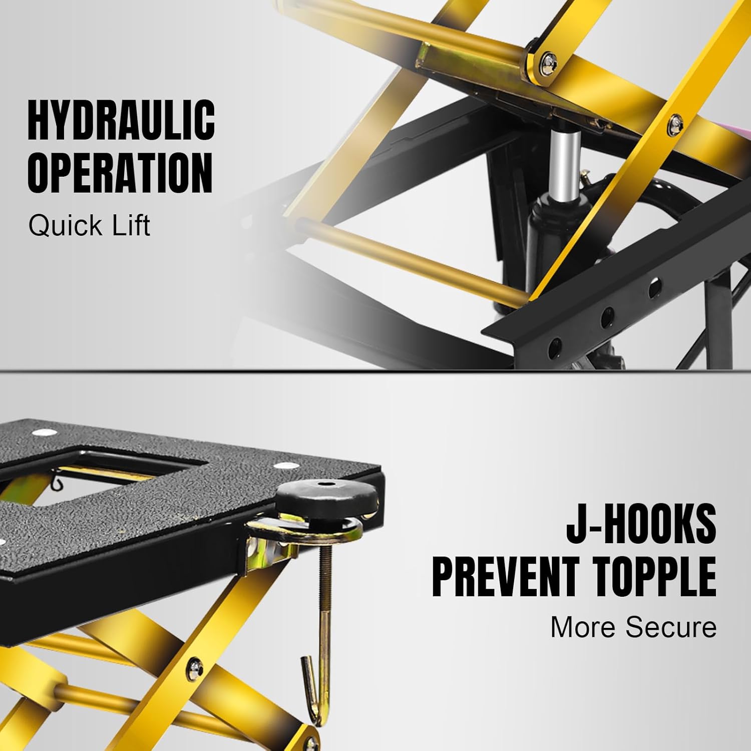 • Easy to Use: Foot pedal design for easy lifting. Hydraulic operation allows for quickly lifting. This scissor lift also has 2 pcs 360° swivel casters and 2 pcs lockable casters.
