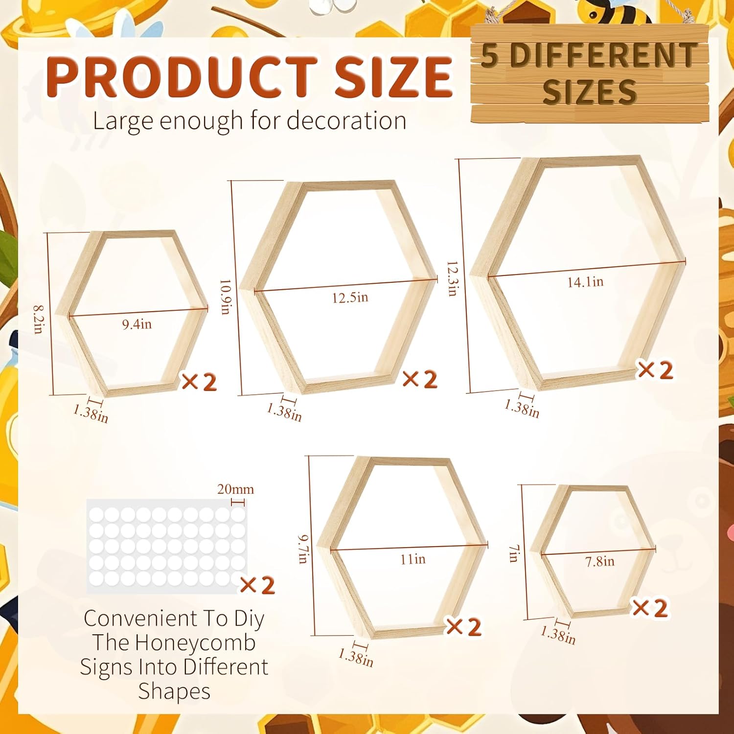 | Included Components | 10 x Hexagon wood shelf centerpieces, 100 x Glue points |
