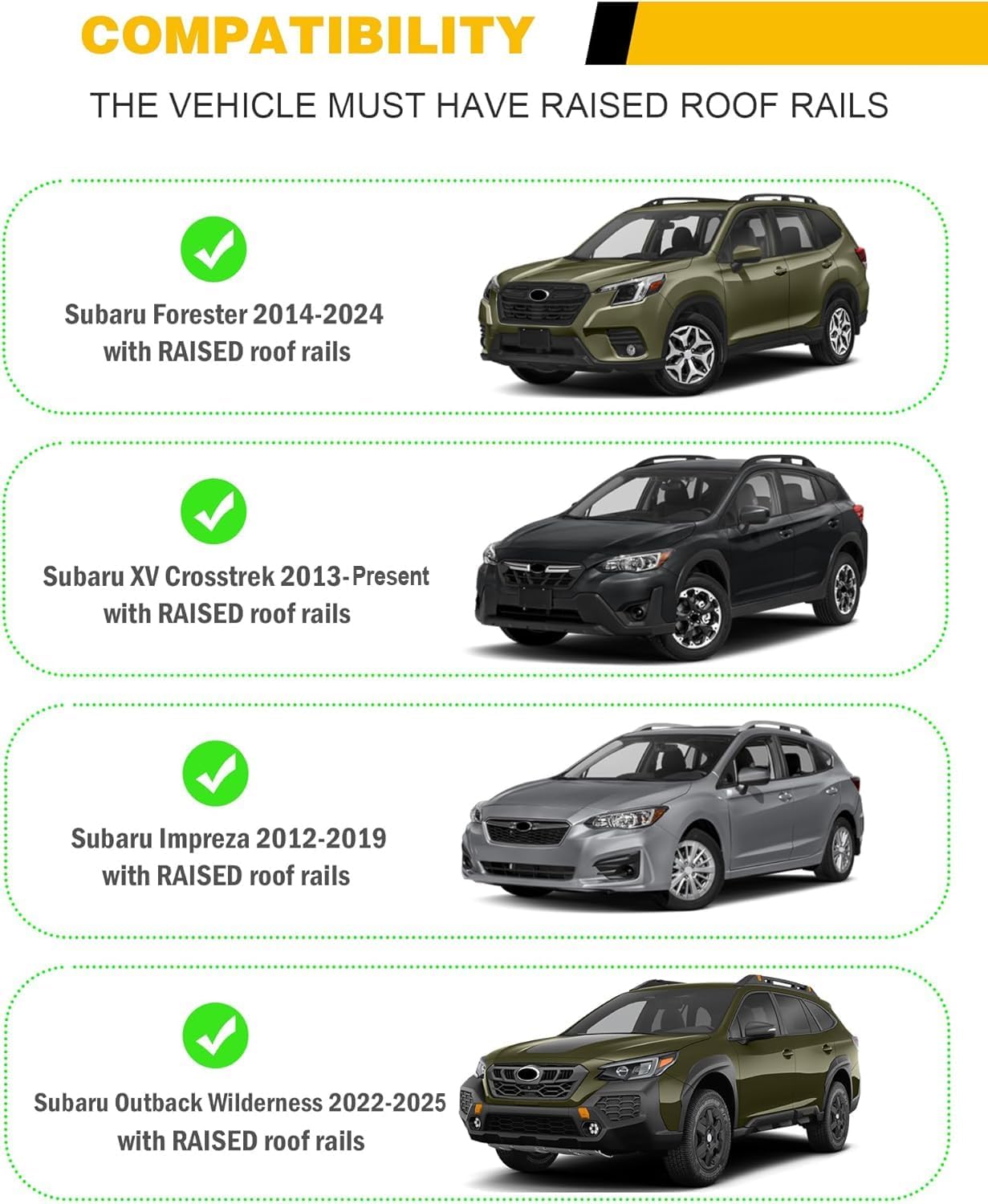 | Compatible with Vehicle Type | Fit for 2014 - 2024 Subaru Forester & 2013 - 2026 XV Crosstrek & 2012 -2019 Impreza & 2022 - 2025 Outback Wilderness |
