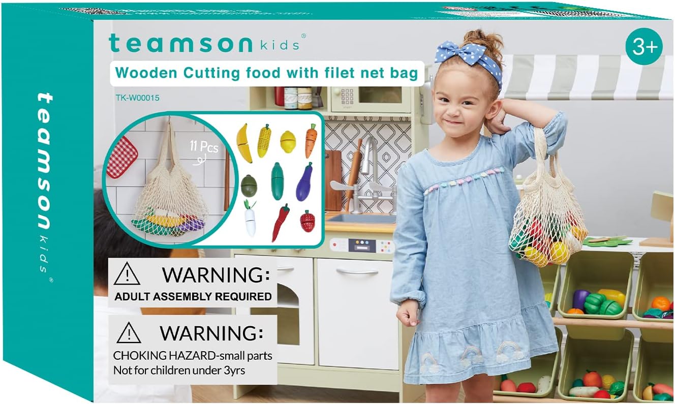 • DESIGN: Pretend fruit and vegetables "cut" into pieces so your little chef can practice their cooking skills, and the tote netted bag fits everything inside to complete playtime. Complements Teamson Kids wooden play kitchens or Little Helper market stand.