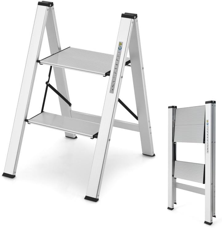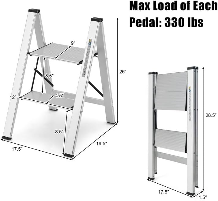 Highlights-Made of sturdy and lightweight aluminum-Stable triangle structure for higher sturdiness-Anti-slip design ensures high-level safety-Quick-folding design for space-saving storage-Can be also used as a storage shelfSpecificationDimensions:19.5 in * 17.5 in * 26 inWeight:7.5 lbMaterial:AluminumOverall Dimension:19.5" x 17.5" x 26"Folding Dimension:28.5" x 17.5" x 1.5"Dimension of Larger Pedal:12" x 9"Dimension of Smaller Pedal:12" x 4.5"Weight Capacity:330 lbsNet Weight:7.5 lbsDetails● Sturdy Aluminum Frame: The step ladder is constructed of 0.05-inch thickened aluminum pipes, which are sturdy, rustproof and lightweight. Moreover, the fastened supporting brace, safety buckle and embedded reinforced beam ensure higher stability.● Anti-Slip Design: The wide pedals with anti-slip texture keep you standing more stably. Also, the non-slip rubber feet can firmly grip the ground, making the ladder quite safe to use.● Easy to Carry and Store: When the ladder is not in use, you can fold it into a compact size measuring only 28.5" x 17.5" x 1.5" (L x W x Thickness). The 1.5" thickness of folded ladder fits every corner of your room. Also, the ladder weighs only 7.5 lbs, which is effortless to carry.● Multifunctional Ladder: With this 2-step folding ladder, you can reach higher with less effort. Whether you want to clean windows, change bulbs or fetch things from high place, the step ladder will always help you a lot. Plus, it's also perfect as a storage shelf.● No Assembly Need: This 2-step ladder has been fully assembled before delivery. What you need to do is just expanding it to use directly. Come to own this ladder which makes your daily life easier!