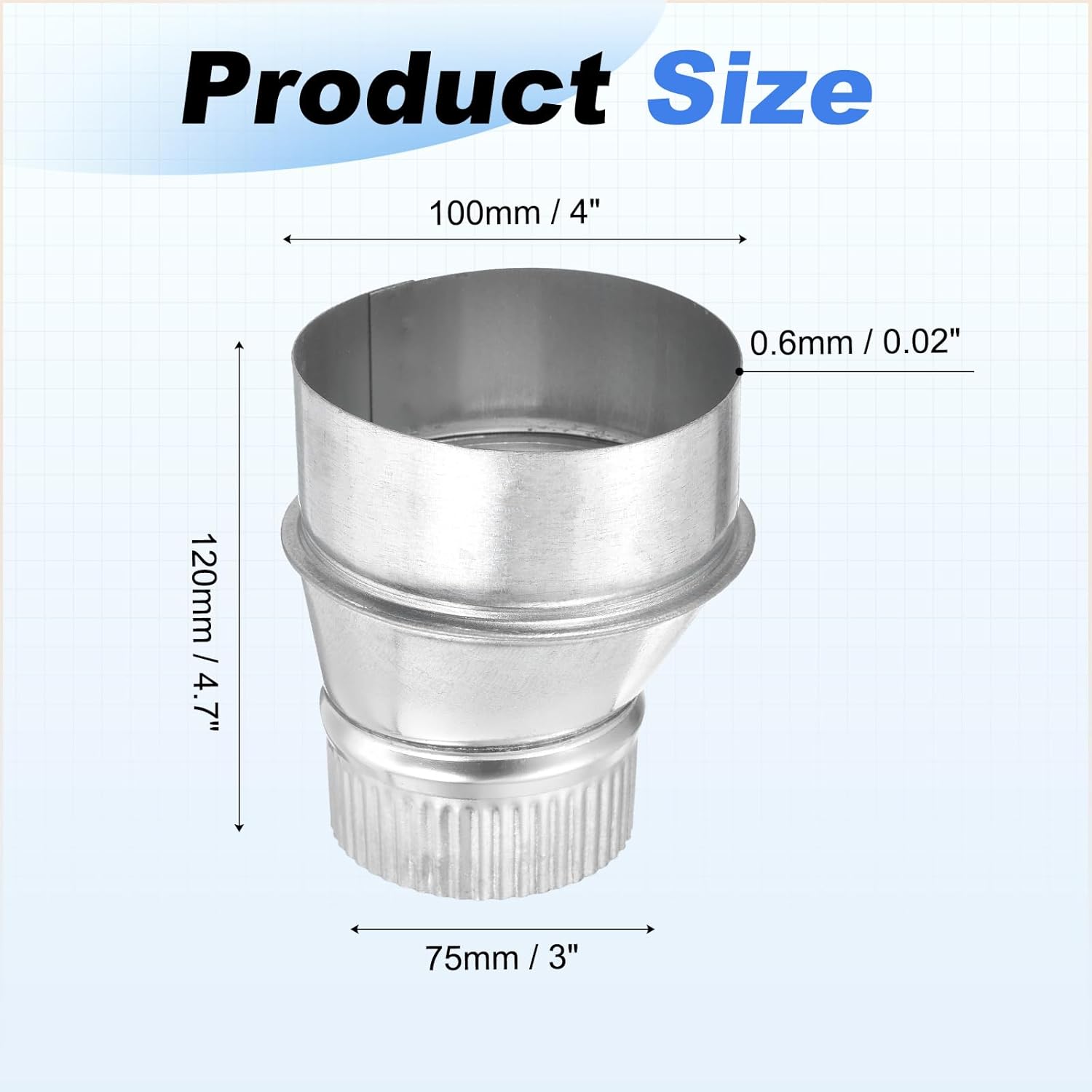 • [WHAT IT IS]: Interface outer diameter: 100 mm / 4 inch, 75 mm / 3 inch; Height: 120 mm / 4.7 inch, Thickness: 0.6 mm / 0.02 inch, Packaging content: 1pcs x Eccentric Air Duct Reducer