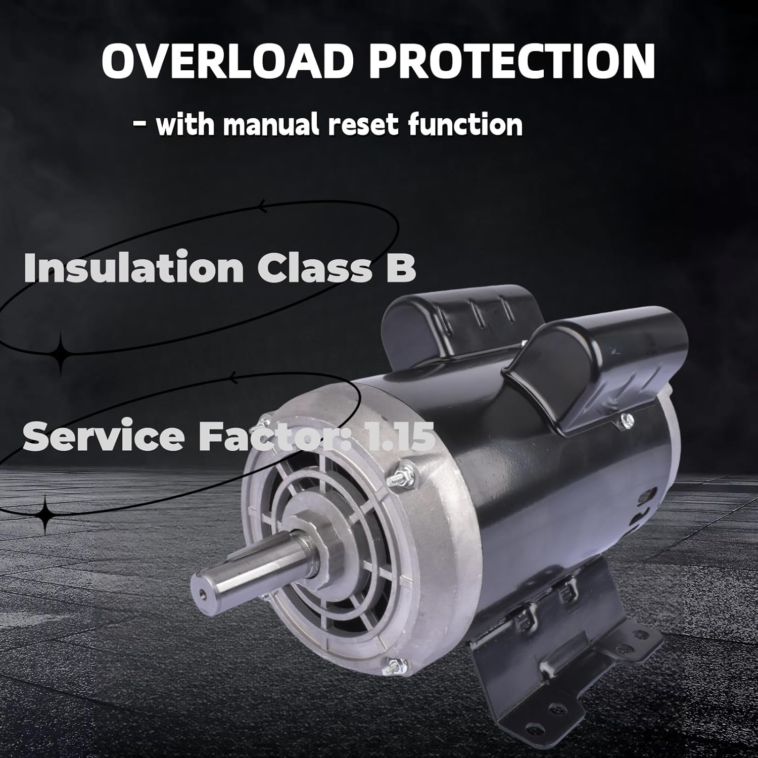 Part Numbers56283138233788052322006454421193SpecificationsPower 5 HP SPLFLA 24.9SFA 27.3RPM: 3450Frame: 184TShaft Size: 7/8" x 2 1/4" with KeywayShaft height: 4.5" (Measured to Shaft Center)Base: Flat Rigid Mounting BaseVoltage: 208-230V 60hz, 24.9 AMPSPhase: Single PhaseService Factor: 1.15Insulation Class BBall BearingsOpen Drip Proof EnclosureManual Overload ProtectionFeaturesHigh starting torque design for compressor duty applications.Overload protection with manual reset.Steel frame and base.Welded base. Capacitor start/capacitor run.NoteProfessional installation is highly recommended.Suggestions for use. 1. Turn the shaft by hand to see if the motor shaft can rotate normally. 2. Don't run with load first, run the machine for a few minutes, everything is normal and then take the load.3. When running with a load, it is best to use an ammeter to measure the actual running current, to see if there is more than the rated value marked on the nameplate.