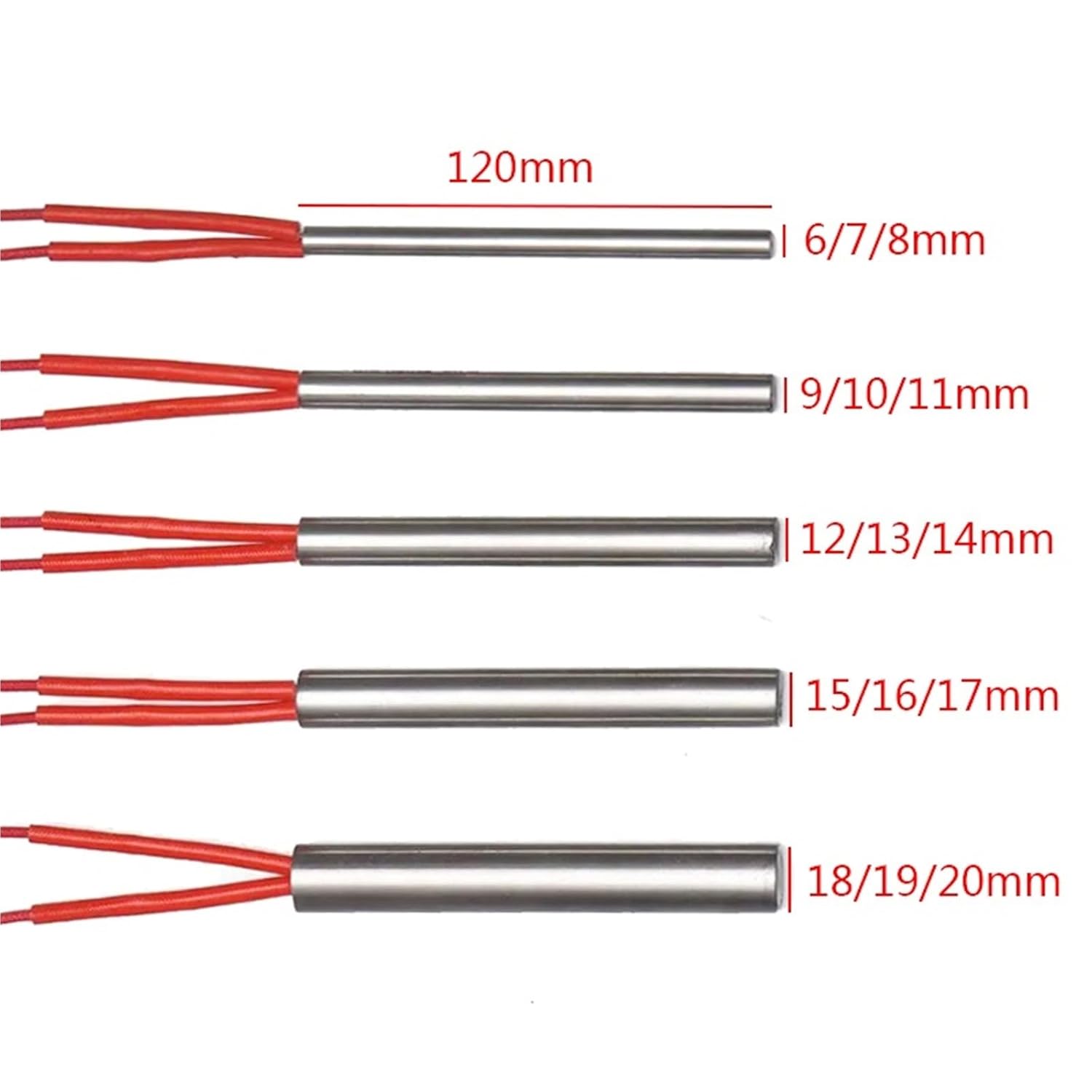 Stainless Steel Electric Cartridge Heating Rod 220V 6MM-20MM Dia. 120MM Length Red Wire Industrial Heater for Molding1.Tube Material: 201 stainless steel 2.Voltage: 220V 3.Wattage:50-150W4.Tube Diameter: 6-20MM6.Tube Length: 120MM7.Wire length:30cm8.Package:1pcs Heating pipe according to you choosePay attention: Power Allowance-10%~+5%Origin : Mainland ChinaProduct Name : Cartridge Heating ElementVoltage : 220VDiameter : 6-20mmLength : 120MMPower : 50-150WWire Length : 30cm/11.8inchTube Material : 201SUS