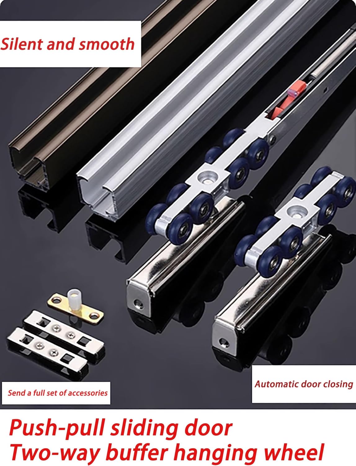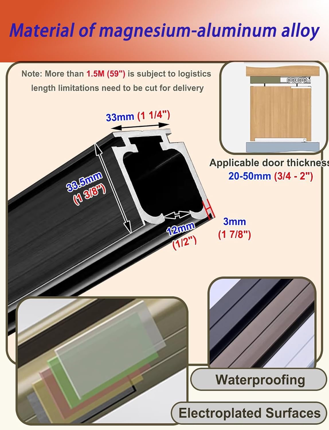 Transform your living space with our versatile barn door track kit, designed to save space while adding a touch of modern elegance to any room. Perfect for both single and double doors, this kit not only enhances the aesthetic appeal of your interior but also maximizes functionality without the need for traditional swing doors.Package Includes:- 1 x Pocket Door Track (Doors not included)- 1 x Soft-Close Mounting KitSpecifications:- Door Thickness: 20-50mm (3/4 - 2")- Recommended Door Length: Over 55cm (21 5/8")- Suitable for Wooden Doors- Box Rail Material: Durable Aluminum Alloy- Wheel Material: Zinc Alloy and Nylon for smooth operation- Available Colors: Black, Silver, Gold - Box Rail Dimensions: Width 33mm (1 1/4"), Thickness 3mm (1/2"), Height 33.5mm (1 3/8")- Customization: Length can be customized and cut to fit your needs- Note: For logistics reasons, lengths over 1.5m (59") will be cut for shippingFeatures:- Designed with pulleys for exceptional load-bearing capacity- Silent sliding mechanism ensures a peaceful environment- Constructed from waterproof and colorfast aluminum alloy- Electroplated surface provides high temperature resistance- Easy installation process, especially with a partner- Adjustable screws allow for height modifications- Versatile for folding doors, barn doors, and double doors- Comprehensive kit includes all necessary components for setupCustomer Care:If you receive any damaged or missing parts, please reach out via email for prompt assistance. Please note that manual measurements may have slight variations of 1-2 cm, and colors may differ slightly due to lighting and monitor settings.