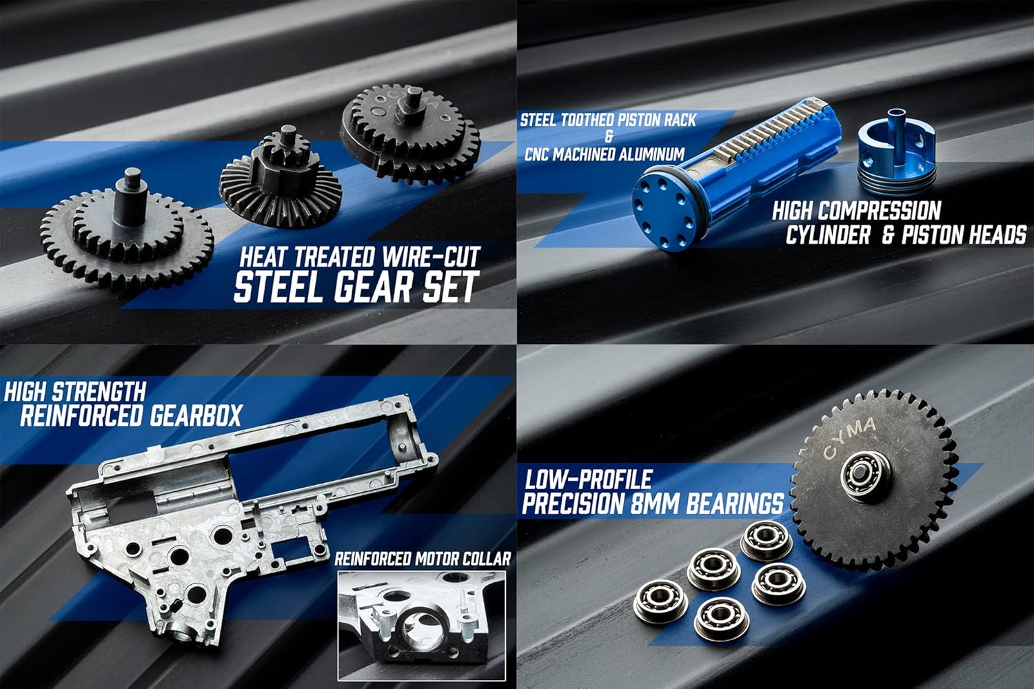 Born from the idea of a soldier being able to resupply behind enemy lines and operators being able to leave a smaller footprint to conceal their presence, the SR-47 combines the familiar M4/M16 with the legendary 7.62x39mm cartridge used by the AK-47. The SR-47 was designed to allow operators to utilize munitions acquired on the field from the enemy in situations where resupply is not an option. Additionally the SR-47 has the added benefit of sounding like a typical AK-47 and not an M16 which helped mask an operators presence as well as being able stay covert by not leaving any evidence such as casings from a NATO weapon. The CYMA AR47 is a hybrid gun that at its core is an AR15/M4 platform based on the venerable Tokyo Marui Version 2 Gearbox but with a sprinkling of AK flair. This essentially allows you to run an AK like setup, but with the ergonomics and modularity of an AR15. This also gives the rifle a plethora of upgrades and customization internally and externally as both the AR15/M4 rifle platform and Ver.2 gearbox are among the most popular in the industry. New to the CYMA lineup is the Quick Buffer System (QBS) which allows for rapid spring changes that can be done by hand. This efficient new system only requires the removal of your buffer tube castle nut to gain access to the captured guide rod and spring. No longer is it necessary to break open your receiver or even remove your stock from the buffer tube to change a spring.